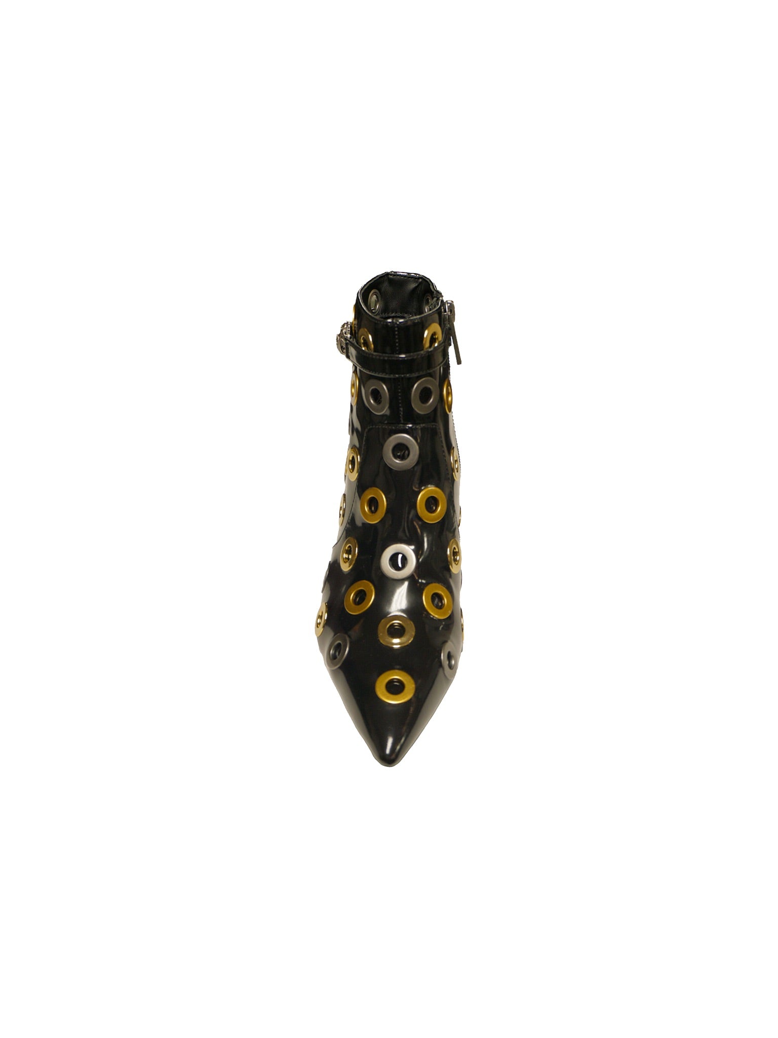 Stivaletto in vernice nera con borchie oro e argento e tacco basso