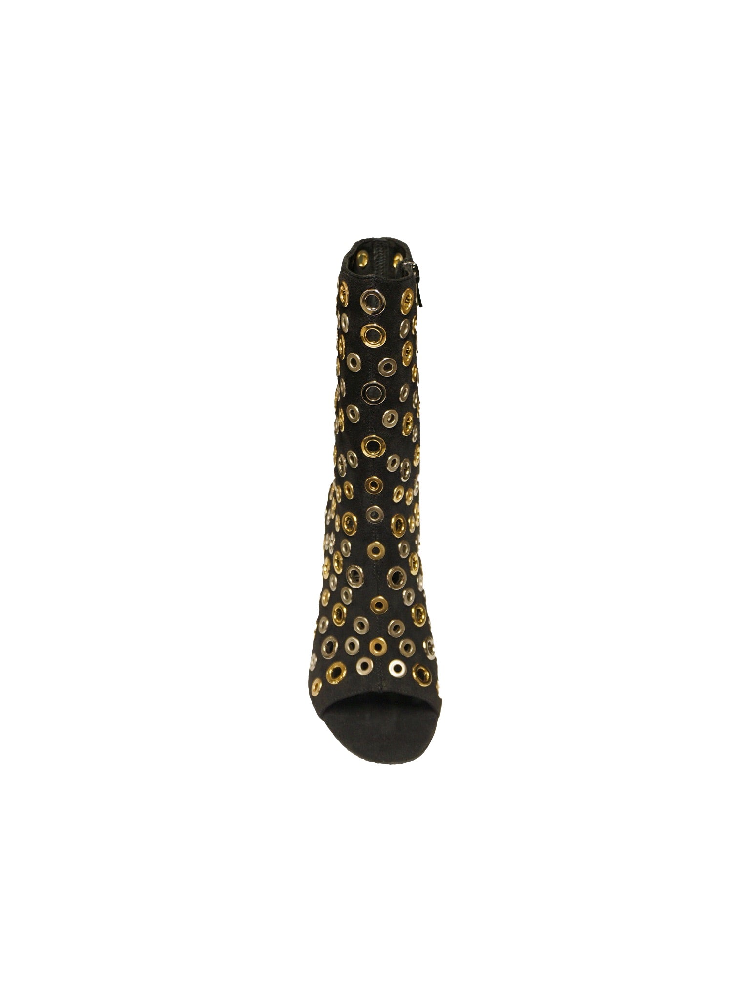 Stivaletto nero scamosciato con occhielli oro e argento e tacco a spillo